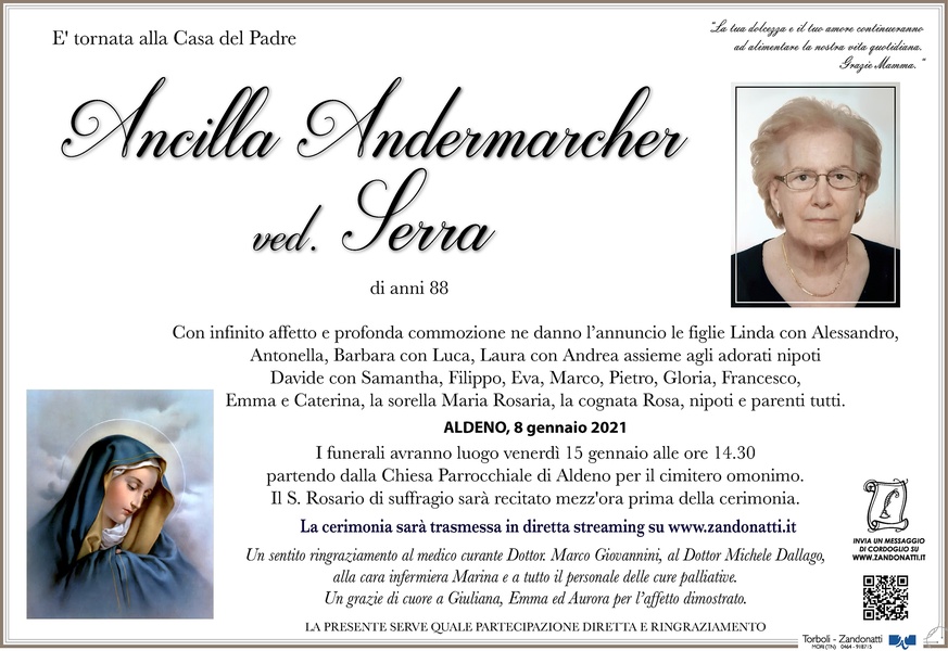 Partecipiamo al dolore per la perdita della vostra cara mamma e nonna Ancilla. Un abbraccio Carla,Tiziana Arianna Dallago e familiari.