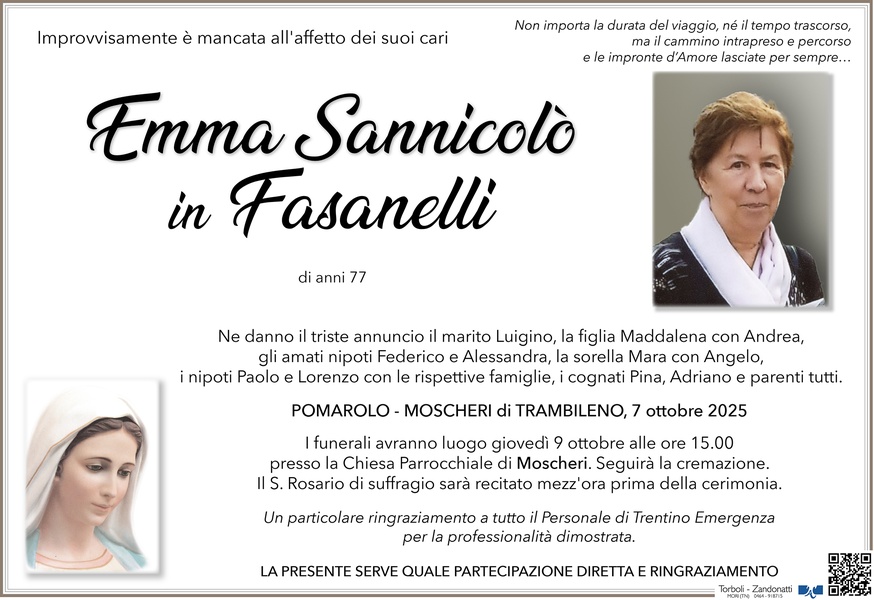 Impossibilitato a partecipare alla cerimonia funebre porgo a tutti voi le più sincere condoglianze per l'improvvisa perdita della vostra cara Emma. Pedrotti Narciso