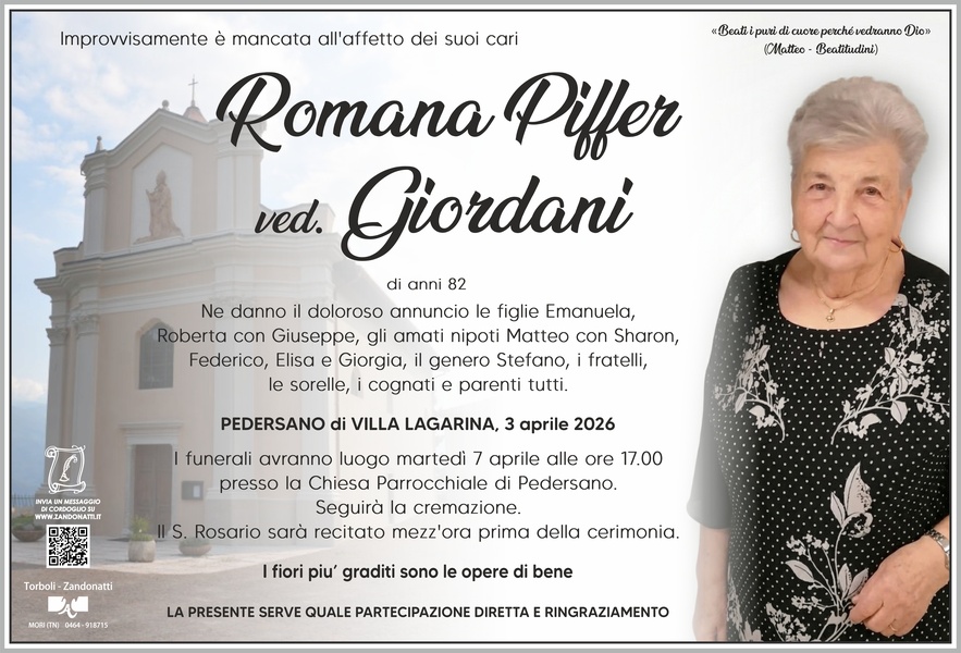 Care Emanuela e Roberta, cari familiari, vicini con il cuore e la preghiera, confidiamo che la fede in Cristo Risorto vi sostenga e vi conforti. Romana ci lascia un grande esempio di amore e di fede. Tutta la vita ha servito il Signore e la Sua chiesa fino ad essere chiamata nello stesso giorno della Sua passione. Ora la sua Pasqua è con l'amato Gino; a voi l'onore di portare il suo esempio nelle vostre vite, a noi quello di portarla nel cuore con un grande grazie per tutto quello che ha fatto per la comunità. Siamo certi che la sua luce continuerà ad illuminare il vostro cammino. Un forte abbraccio solidale.