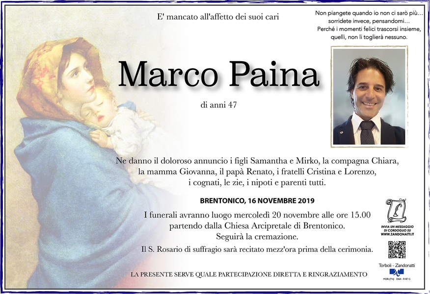 Profondamente dispiaciuta per la prematura scomparsa di Marco. Sorriderò sempre pensandoti perchè questo è quello che hai sempre trasmesso a me e alle persone che avevi intorno. Un grosso abbraccio a papà Renato e a tutta la famiglia. Condoglianze.