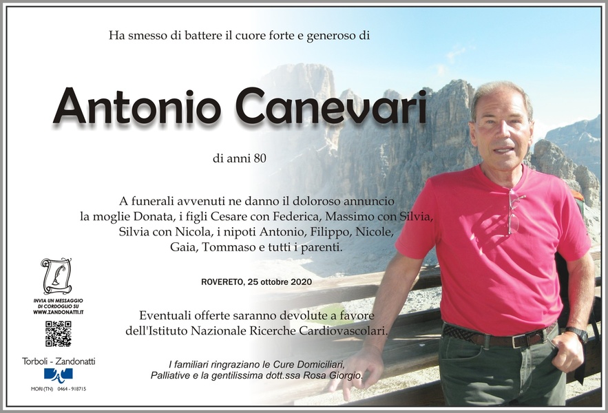 Riva del Garda 29/10/2020 Solo oggi sono venuto a conoscenza, con dolore, della scomparsa di Antonio Canevari. Sapevo della sua grave condizione di salute e dell'impossibilità di una visita. Porgo le condoglianze mie e di mia moglie, alla signora Donata. ai figli Cesare, Massimo e Silvia e ai nipoti e parenti tutti. Con dolore per la scomparsa di un amico. Antonio, Teresa e Silvia Destro.