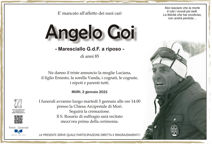 Ad esequie avvenute, ho appreso della triste dipartita del caro Angelo, con il quale ho condiviso alcuni indimenticabili momenti di sport e di vita a Rovereto. A tutti voi, ed in particolare ad Ernesto, anche lui partecipe di quei bei momenti, le più sentite condoglianze da parte mia e della mia famiglia. Roberto Adami - Pomarolo