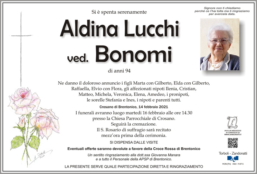 Le nostre più sincere condoglianze a tutti i parenti e amici. Aldina sarà accolta in cielo da una canzone suonata con la fisarmonica dal suo caro marito. Una abbraccio forte a tutti.