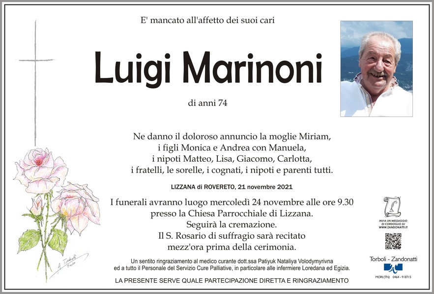 Siamo vicini alla moglie Miriam, Andrea e Manuela, alla figlia Monica, per la perdita del caro padre Luigi Marinoni. le nostre più sentite condoglianze. Marco Donatella. Zio Carmelo e zia Angela.