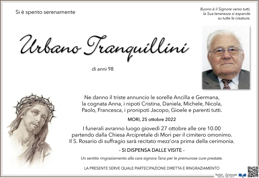 Mi unisco alla comunità di Mori per ringraziare il Signore dei 98 anni di vita de vostro caro Urbano. Con la sua vivacità, fede e intramontabile curiosità e ricerca rimarrà tra noi quale maestro di vita. Condivido il vostro dolore e prego il Dio della Vita che ci conceda di continuare il nostro cammino con quell'entusiasmo di vivere che Urbano ci lascia in eredità.