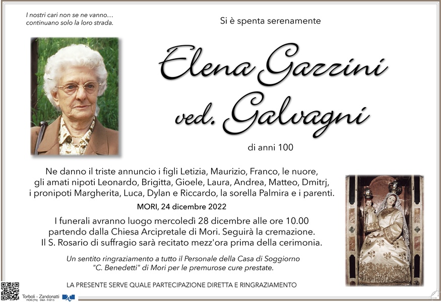 Ricordo con tanto affetto Elena, nella vicinanza quotidiana del rione, degli anni giovanili. Ora il Signore l' ha chiamata a sè, dopo questa sua lunga e fruttuosa vita. Siamo vicini ai figli e familiari tutti, in questo triste momento.