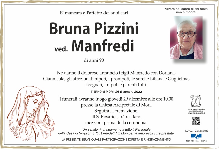 Partecipo al vostro dolore, ricordando la cara Bruna con la preghiera. Sentite condoglianze.