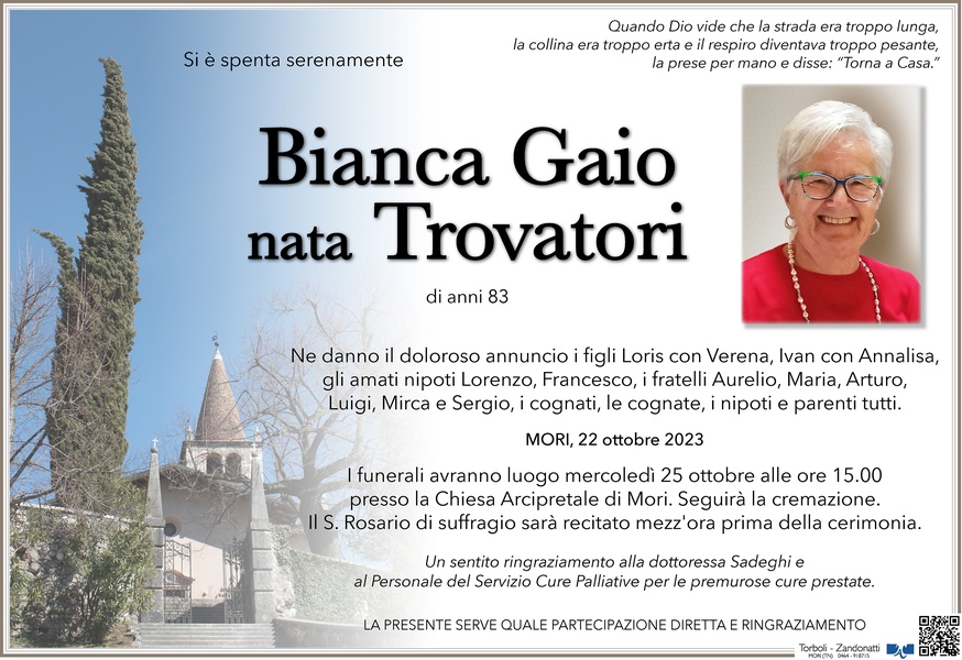 Cara Bianca, ricordiamo il tuo sorriso, la tua disponibilità, le tue parole buone per tutti. Sinceramente dispiaciuti porgiamo a tutti i famigliari le nostre condoglianze