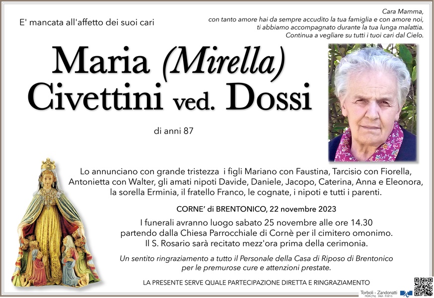 Ci uniamo al vostro grande dolore per la perdita della vostra Cara amata mamma e nonna. La ricorderò caramente con immenso affetto,sei stata una mamma amorevole, una grande donna meravigliosa, il suo animo buono e dolce. Carissimi figli so benissimo con quanta dedizione e amore l'avete accudita, ma la grandezza del suo cuore ❤ rimarrà per sempre nel vostro. Quando si perde una mamma si perde una parte del vostro cuore, ma la fede nel Signore vi sostenga e vi conforti con la preghiera 🙏,il grande amore, l'esempio che vi ha donato continui a nutrirvi il vostro cuore con i suoi meravigliosi ricordi di una vita trascorsa assieme. Adesso Cara Mirella ti sta aspettando un percorso, il Signore nel suo magnifico Regno di Luce, dove non esiste più sofferenza, ma la Pace Eterna, dove sarai accolta dai tuoi angeli Con sincero affetto vi stringiamo in un grande abbraccio a Antonietta, Mariano, Tarcisio e tutti i famigliari. Norma Fusari, assieme a mamma Ida Passerini e Mariano Manfrini.