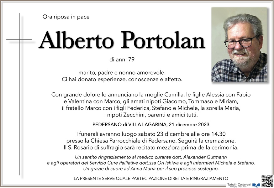 Profondamente commossi, porgiamo le più sentite condoglianze per la perdita del caro Alberto. Famiglia Giordani Sandro, Bruna e Julka.