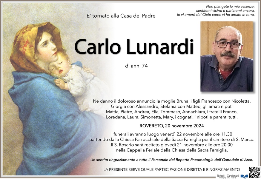 Cara Bruna e familiari partecipo al vostro grande dolore per la perdita del vostro caro Carlo. Sarà sempre vivo nel vostro cuore se seguirete il suo esempio di vita. Sentite condoglianze a tutti voi e ai fratelli. Paola Wegher e famiglia