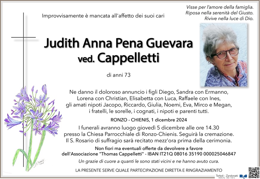 Partecipiamo al dolore per la perdita della Vostra cara mamma, della quale ci rimarrà un caro ricordo. A tutti sentite condoglianze. Il Direttivo dell'Associazione Thomas Cappelletti.