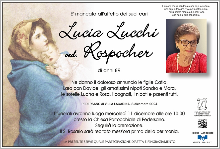 Lucia, sei stata più di una cara amica per la nostra famiglia. Che il Signore accolga il tuo sorriso simpatico e la tua bontà. Vi abbracciamo tutti. Zandonai Giliana, Grandi Cinzia, Agostino e Pietro