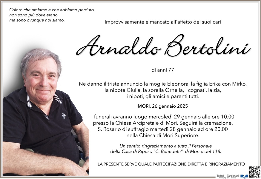 Care Eleonora, Erica, familiari, pur avendo appreso in ritardo la dolorosa notizia, desidero ricordare il vostro caro Arnaldo, come persona positiva e allegra, un bravo artigiano sempre disponibile che ricordo con nostalgia e gratitudine. Con questo spirito vi sono vicino in questo triste momento con le mie fraterne condoglianze.