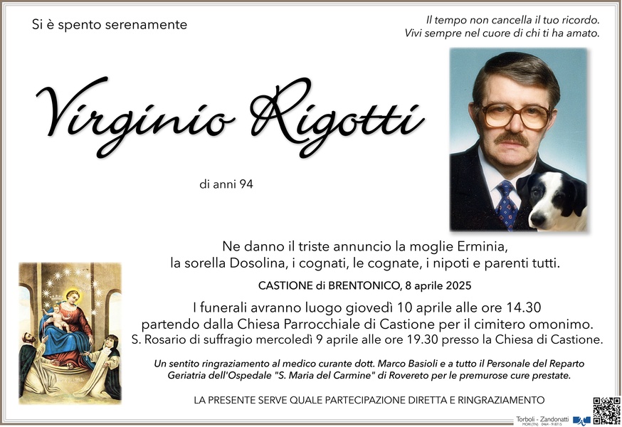 Zia Erminia, le nostre più sincere condoglianze. Con grande tristezza abbiamo appreso la notizia della scomparsa dello zio Virginio. Lo ricorderemo sempre come un uomo grande e molto affettuoso. Abbiamo trascorso momenti meravigliosi con lui e te. Vi mandiamo un forte abbraccio in questi momenti di dolore e che Dio e la Vergine vi diano conforto e forza per andare avanti. Ti amiamo moltissimo. Clemente Rigotti, Donatila, Jeannette, Sergito e Matteo
