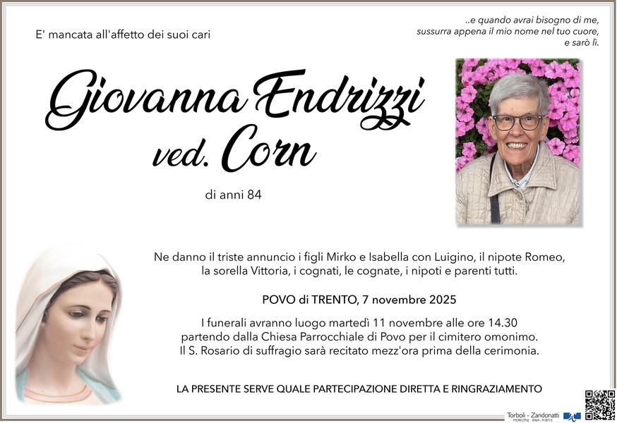 I funerali avranno luogo martedì 11 novembre alle ore 14.30 partendo dalla Chiesa Parrocchiale di Povo per il cimitero omonimo. Il S. Rosario di suffragio sarà recitato mezz'ora prima della cerimonia.