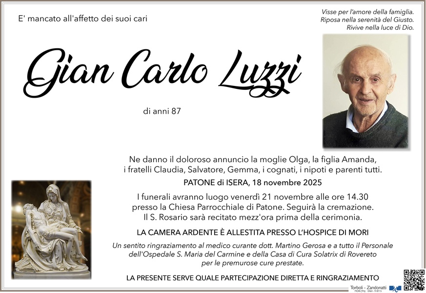 Carissime Olga ed Amanda, ho appreso con tristezza la notizia della morte del vostro amato Gian Carlo. A nome della Fraternità di Rovereto dell’Ordine Francescano Secolare (OFS), vi porgo le nostre più sentite e cristiane condoglianze per la vostra perdita. Porgiamo le nostre condoglianze anche ai fratelli, cognati, nipoti e parenti tutti. Vi siamo vicine con tanto affetto e la nostra preghiera vi sia di conforto e vi sostenga nel dolore. Accompagnamo Gian Carlo nel suo ultimo viaggio con la preghiera perché il Signore lo accolga nella comunione dei Santi e nella dimora della luce e della pace. vi vogliamo bene. cecilia garniga