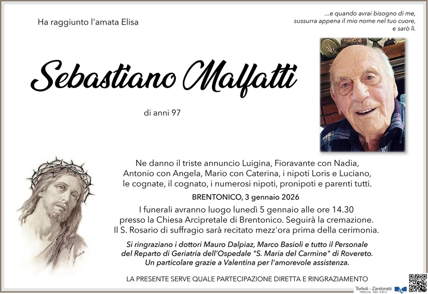 Ci stringiamo fortemente al vostro grande dolore per la perdita del vostro Caro amato Sebastiano. La perdita di Sebastiano è una ferita che lascia un vuoto incolmabile, ma sono certa che il suo grande amore che vi ha dimostrato è il suo spirito continueranno a vivere attraverso ogni suo ricordo che porterete in voi. IL Signore ti ha chiamato nel suo Regno di Luce e nell'amore, accogli Sebastiano nella Pace e concedile il Riposo Eterno e sarai abbracciato dalla tua Cara Elisa .Vi siamo vicini e vi sosteniamo con il pensiero e la preghiera nel suo ricordo. Un grande abbraccio a Luigina e a tutti i famigliari . Norma Fusari assieme a mamma Ida Passerini ved Fusari e Mariano Manfrini.