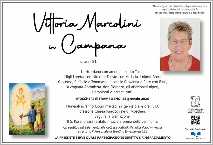 Dispiaciuti per la perdita della cara Vittoria, la affidiamo con la preghiera alla Madonna de La Salette. Scottini Lorenzo e Luisa.