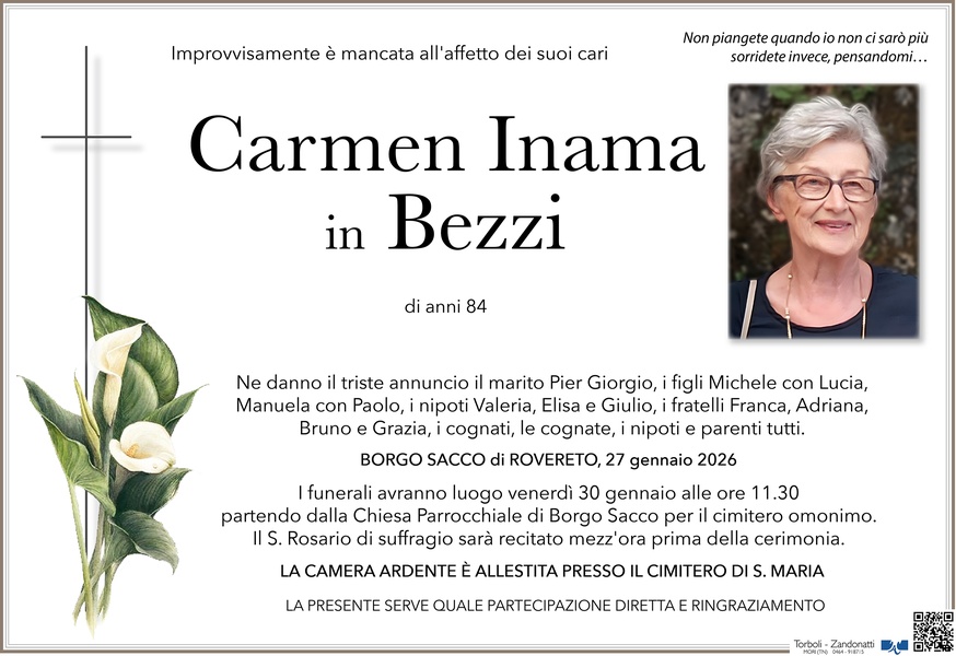 Vi siamo vicini e porgiamo le nostre più sentite condoglianze per la perdita della vostra cara Carmen. Siate fieri e grati di avere avuto una mamma e una nonna speciale che ora vive nella Luce di Dio e da Lassù protegge tutti voi. Un abbraccio di conforto