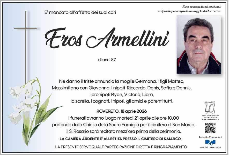 L’Amministrazione comunale di Brentonico esprime il proprio cordoglio per la scomparsa di Eros Armellini e si unisce con sincera partecipazione al dolore della famiglia e dei suoi cari. La comunità lo ricorda con affetto per il suo percorso umano e lavorativo sul territorio, e si stringe alla famiglia in questo momento di dolore.
