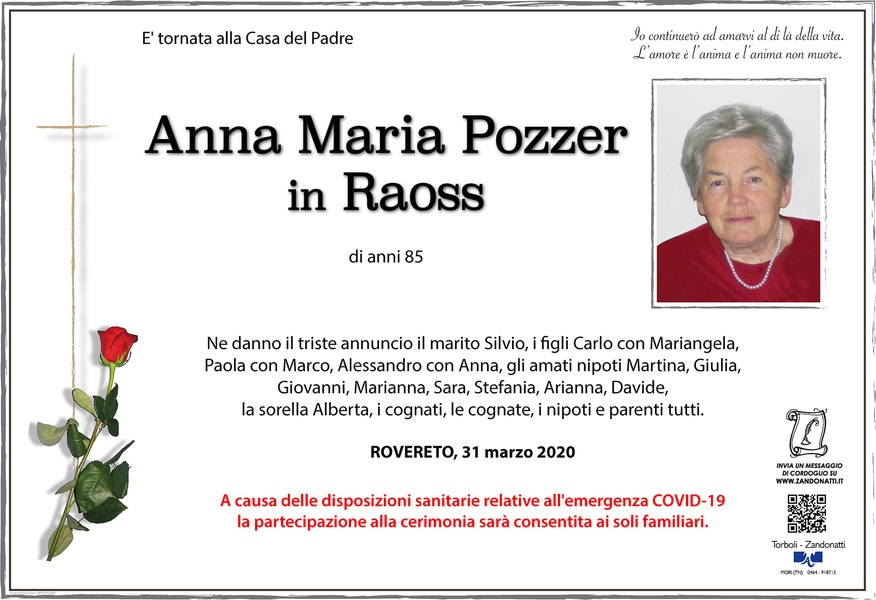 Cara Anna Maria, sei sempre stata solare e piena di vita, disponibile e premurosa nei confronti della nostra mamma e così ti vogliamo ricordare e ringraziare. In questo doloroso momento, ci sentiamo vicini a Silvio e ai tuoi amati figli. Un affettuoso abbraccio!