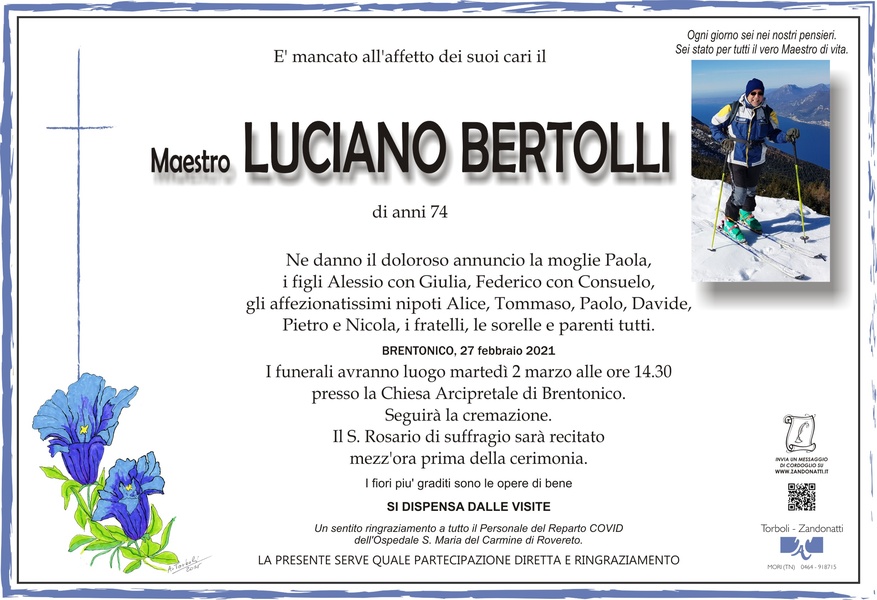 Sentite condoglianze. Uniti con la preghiera al caro coscritto, e stimato maestro di mia figlia, figura brillante nella comunità di Brentonico, che rimarrà sempre presente nei nostri cuori- Aldo Tardivo e famiglia