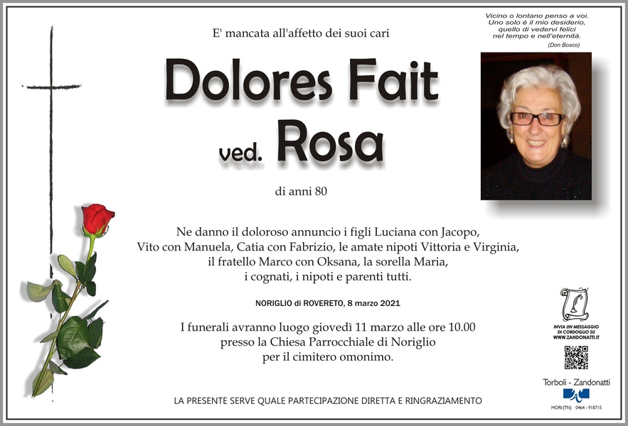Ti avevo promesso che sarei venuta a trovarti coi miei bambini e ti avrei portato “il santino” del mio papà... ci tenevi tanto! Mi spiace di non essere arrivata in tempo... ora vi ritroverete... Ciao Dolores.. riposa in pace. Sentite condoglianze e un sincero abbraccio a tutti i tuoi cari. Luana Fait