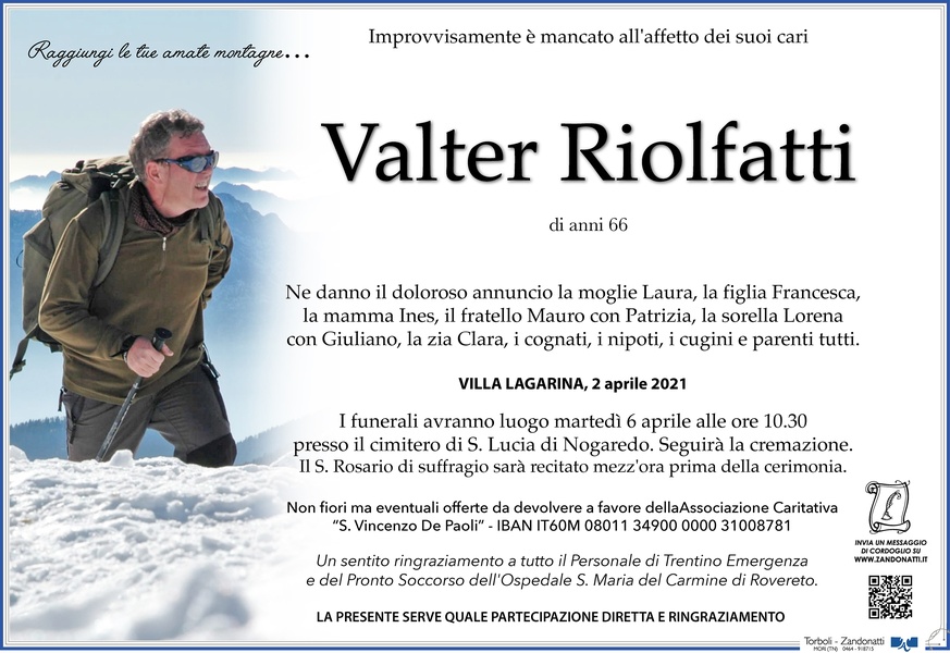 Partecipiamo al dolore della famiglia di Valter e porgiamo sincere condoglianze.