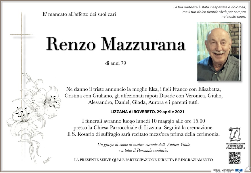 Increduli e sinceramente rattristati dalla scomparsa di Renzo vi siamo vicini in questo momento di dolore e porgiamo le nostre più sincere condoglianze Famiglia Martinelli Mario e Monica. Chizzola di ala , 6 maggio 2021