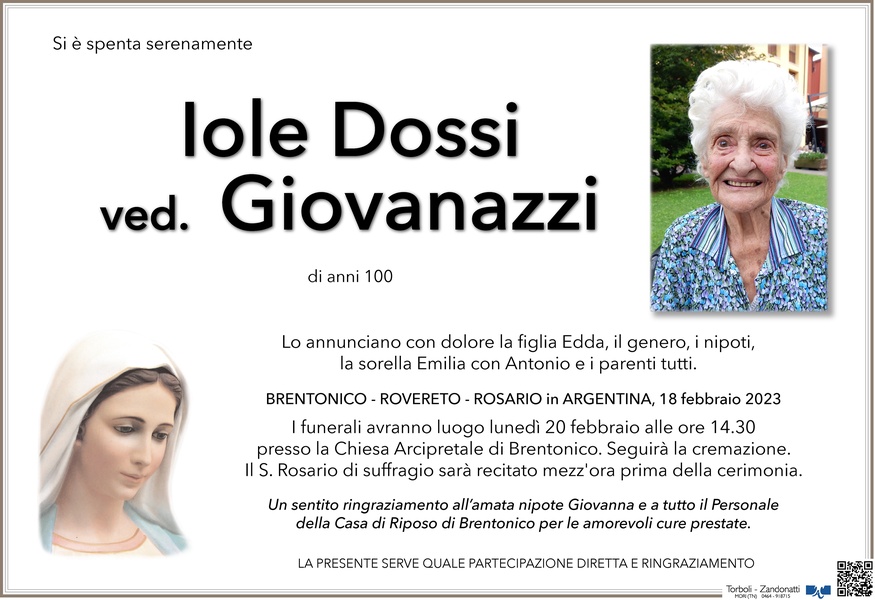 Cara signora Iole, buon viaggio. Sentite condoglianze a chi le ha voluto bene e le è stata accanto in questi ultimi anni. Cristina Manzana, vicina di casa a Brentonico