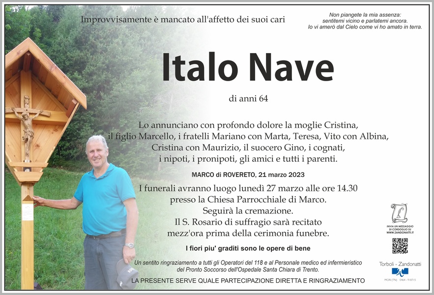 Alla Signora Cristina, al figlio Marcello e a tutti i familiari porgo le mie più sentite condoglianze per la tragica scomparsa del loro amato Italo. Con lui ho frequentato le scuole elementari e talvolta ci si incontrava in città o sulle pendici del Pasubio. Il suo sorriso e la sua gentilezza saranno per me un ricordo indelebile. Riposa in Pace, caro Italo.