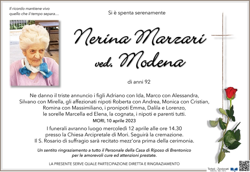 Prendiamo parte al vostro dolore per la perdita della vostra Cara amata mamma e nonna Nerina. Ricorderò la Cara Nerina con immenso affetto e soprattutto con la preghiera 🙏nel suo ricordo. Certo, le parole non possono alleviare il vostro dolore, ma la speranza che la vostra Cara mamma dal Cielo, tra le braccia misericordiose del Signore possa vegliare su di voi, può esservi di conforto con la certezza che l'amore che vi ha donato in vita sarà per sempre nel vostro cuore ❤. Giungano a voi tutti il nostro più profondo cordoglio con un forte abbraccio ai figli, in particolare ad Adriano e famigliari. Norma Fusari e Mariano Manfrini