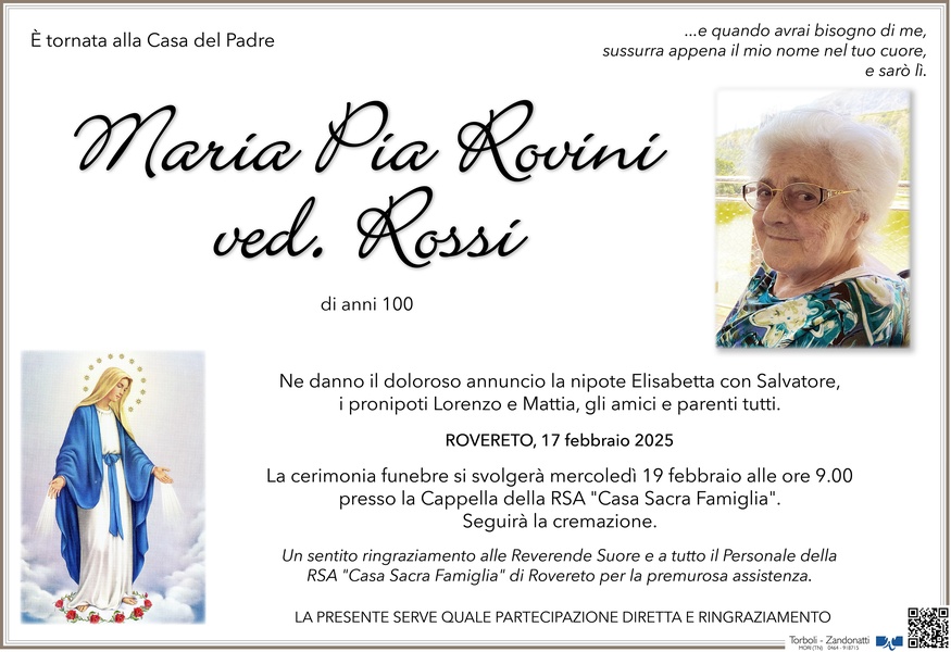 La comunità e la direzione, a nome di tutti gli ospiti e del personale della RSA Casa "Sacra Famiglia", porgono sentite condoglianze.