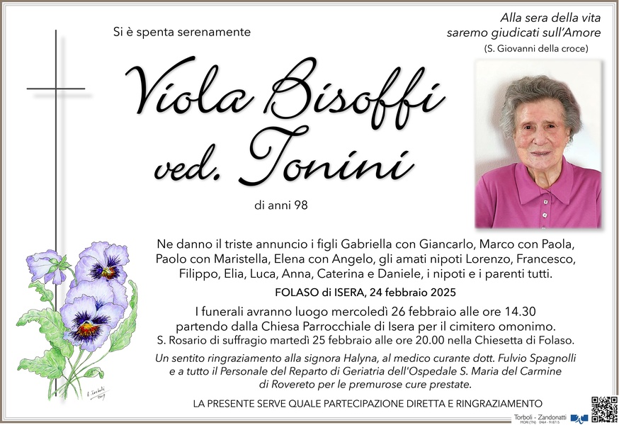 Vi siamo vicini in questo di dolore per la perdita della vostra cara mamma Viola. Sincere condoglianze Spagnolli Carmela, Maria Rosa, Sisto, Beatrice e Rita