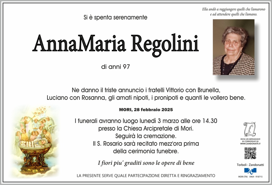 Partecipiamo al dolore dei fratelli per la scomparsa della loro cara Annamaria. La ricordiamo come donna impegnata nel sociale a favore della comunità di Mori. Sentite condoglianze ai familari.