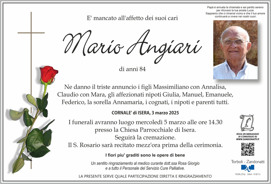 A due giorni dal compimento degli 85 anni essendo nato il 5 marzo dl 1940, ha lasciato la nostra comunità Mario Angiari, un carissimo amico proveniente dalla terra veronese e trapiantato da tanti anni in Vallagarina per motivi di lavoro. Una bruciante e velocissima malattia, dopo un breve periodo ospedaliero, lo ha portato alla morte lasciando i suoi due figli, le loro famiglie, i nipoti e la sorella attoniti con un grande dolore. In una mia recentissima visita a casa mi confidò serenamente che era pronto ad andare a trovare la sua cara Lucia deceduta appena 5 anni fa nel 2020. A Massimiliano e Claudio unitamente a tutti i loro cari in questo triste momento porgo sentite condoglianze per la grave perdita, convinto però che la serenità dimostrata dal papà in questi ultimi giorni lascerà i loro animi con minor tristezza. Mario carissimo, tu qui a Cornalè hai costruito la tua casa negli anni 80 e sin da subito hai amato questa comunità mettendoti spassionatamente al suo servizio. Per molto tempo hai collaborato con l’Unione Sportiva di Isera e per vari mandati ne sei stato Presidente e punto di riferimento per tanti giovani. In quelli anni per vivacizzare la nuova crescente comunità di Cornalè e per sostenere economicamente la sportiva organizzavamo nel mese di maggio, assieme a te, agli amici Gastone ed Edoardo e tanti altri volontari della frazione, la festa di paese chiamandola Maggiolina. Tante volte abbiamo ricordato quelle feste che purtroppo da molti anni non vengono più svolte. Raggiunta una certa età ti sei messo a disposizione del Circolo Anziani e Pensionati El Filò di Isera sin dall’anno 2006 e dall’assemblea del marzo 2008 ne divenni Presidente, incarico mantenuto fino a marzo 2016. Pur uscendo dal direttivo anche ultimamente collaboravi con il circolo gestendo la sede nei momenti di apertura. La tua casa, così pure la tua cantina, era aperta a tutti e non mancavano mai i momenti di incontro tra amici davanti ad un buon bicchiere di Amarone (la zona di provenienza non si dimentica mai), o dal territorio piemontese delle Langhe con ottimi Nebbiolo, Barbera e Arneis. Ora, caro Mario, passando obbligatoriamente davanti a casa tua mi assalirà un groppo alla gola e per un tratto di strada il mio pensiero sarà sicuramente con te. Mercoledì, entrando in chiesa al funerale, il mio sguardo si poserà sul posto dove tu puntualmente tutte le domeniche sostavi partecipando alla messa e pregando la tua cara Lucia. Riposa in Pace, caro Mario, non smetteremo di ricordarti.