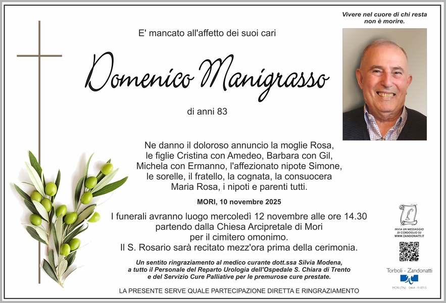 Vi siamo vicini per la scomparsa del vostro amato Domenico, marito e padre affettuoso,un abbraccio a Rosa e alle figlie. Dal cielo vi guiderà ora e per sempre.
