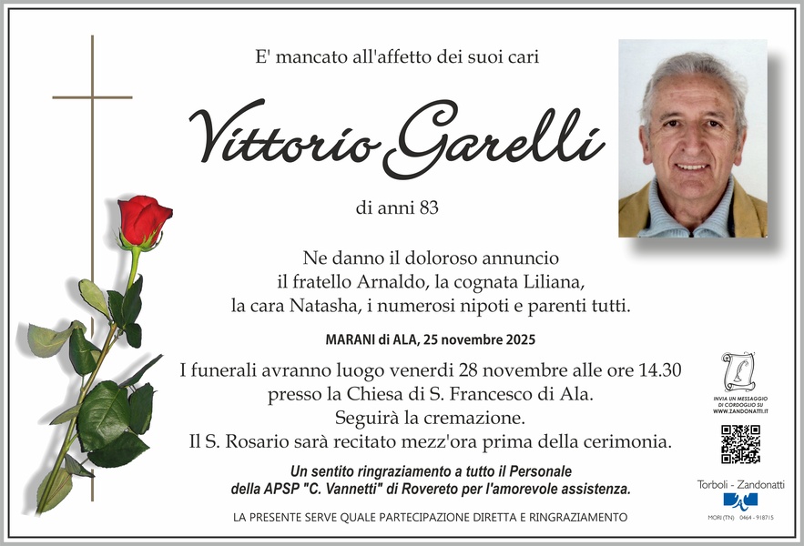 I funerali avranno luogo venerdì 28 novembre alle ore 14.30 presso la Chiesa di S. Francesco di Ala. Seguirà la cremazione. Il S. Rosario sarà recitato mezz'ora prima della cerimonia.