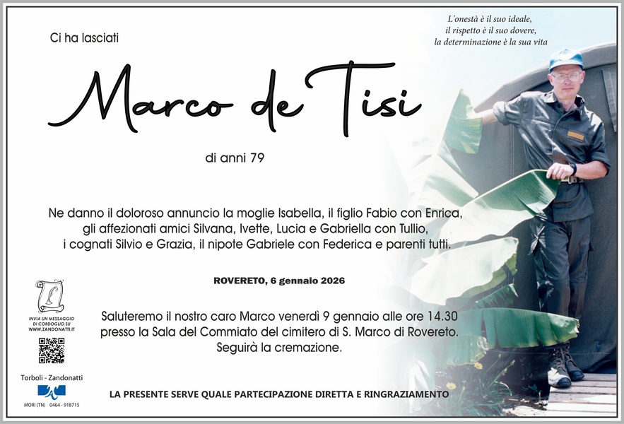 Il Circolo Michael Gaismayr di Trento partecipa commosso alle esequie del benemerito socio Marco de Tisi ed esprime sentite condoglianze ai suoi cari
