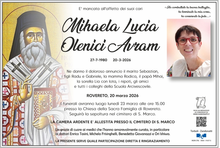 Ne danno il doloroso annuncio il marito Sebastian, i figli Radu e Gabriele, la mamma Rodica, il papà Mihai, la sorella Lia con Iota, i nipoti, gli amici e tutti i colleghi della Scuola Arcivescovile.